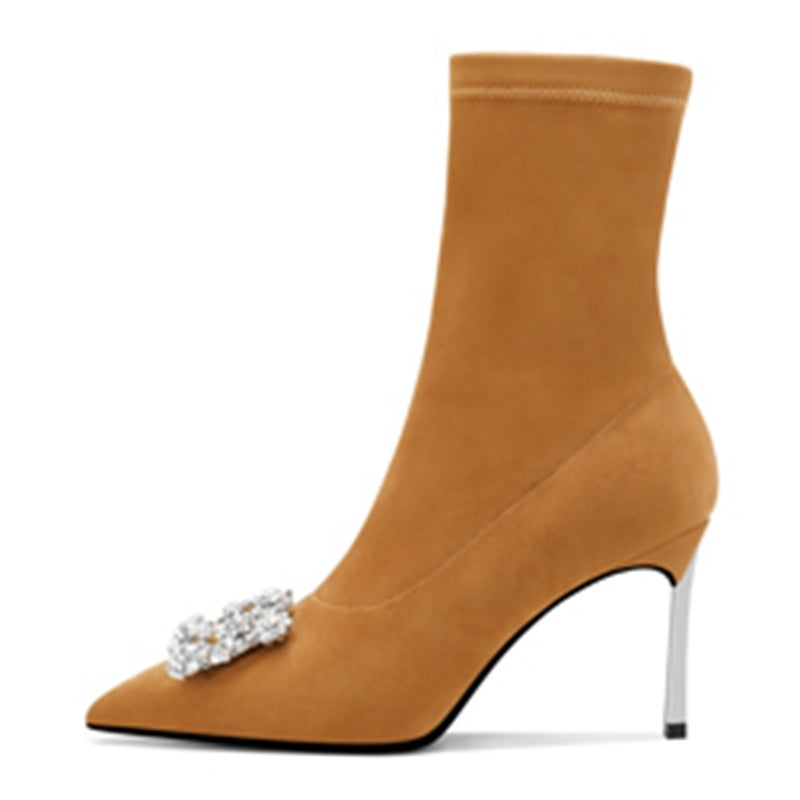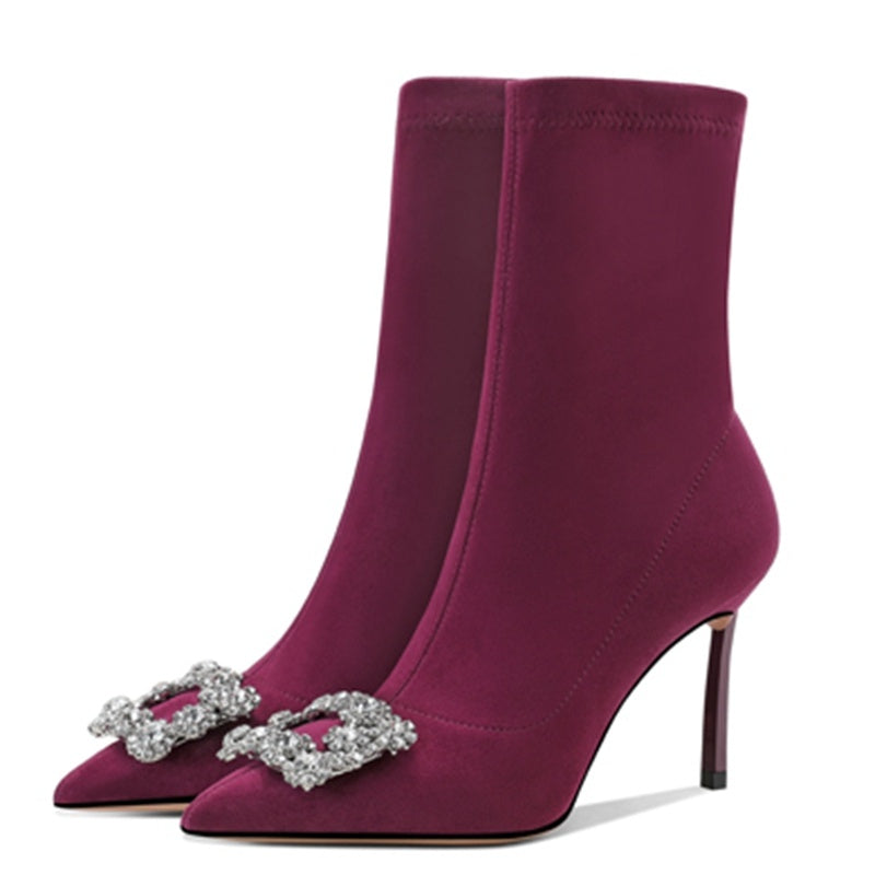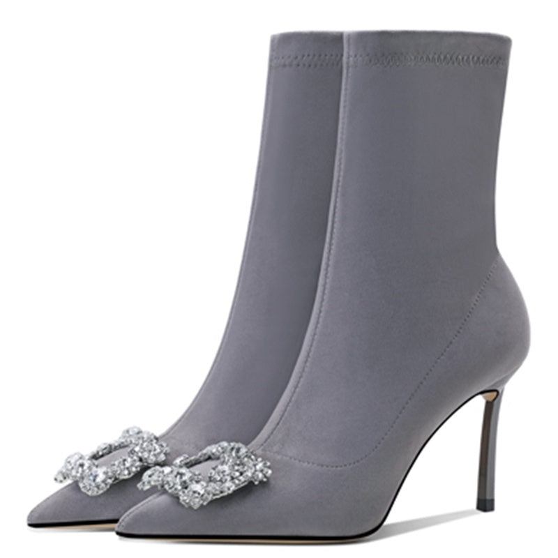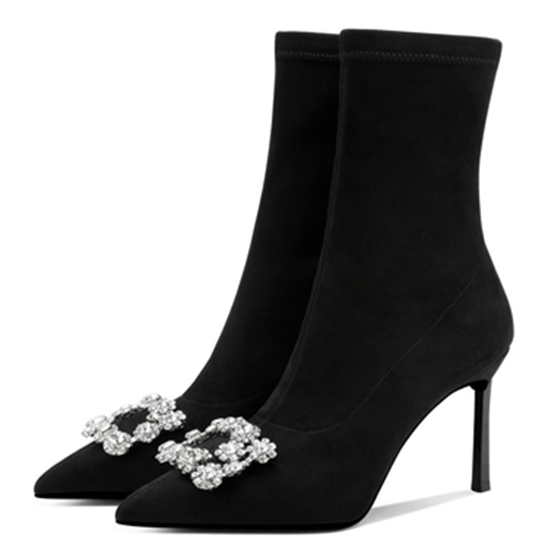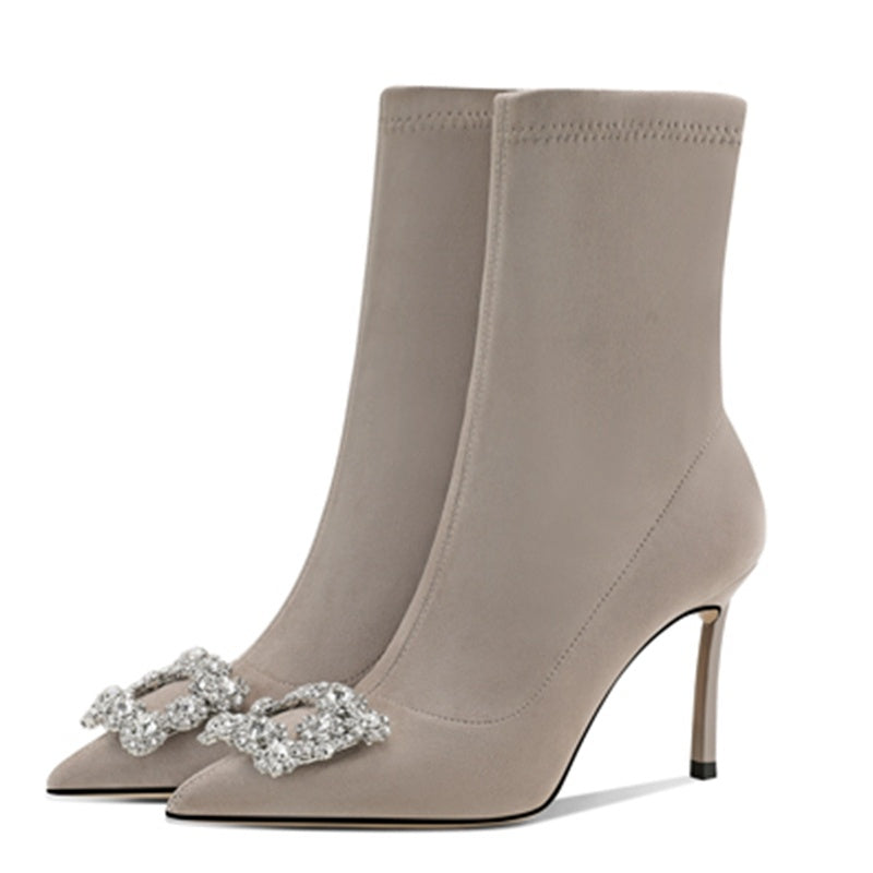 Découvrez l'élégance intemporelle de ces bottes à talon aiguille, conçues pour sublimer votre silhouette et vous offrir un look sophistiqué en toute occasion. Fabriquées avec des matériaux de qualité supérieure, leur tige en tissu finement travaillée est ornée de détails raffinés comme des strass scintillants et des décorations métalliques.